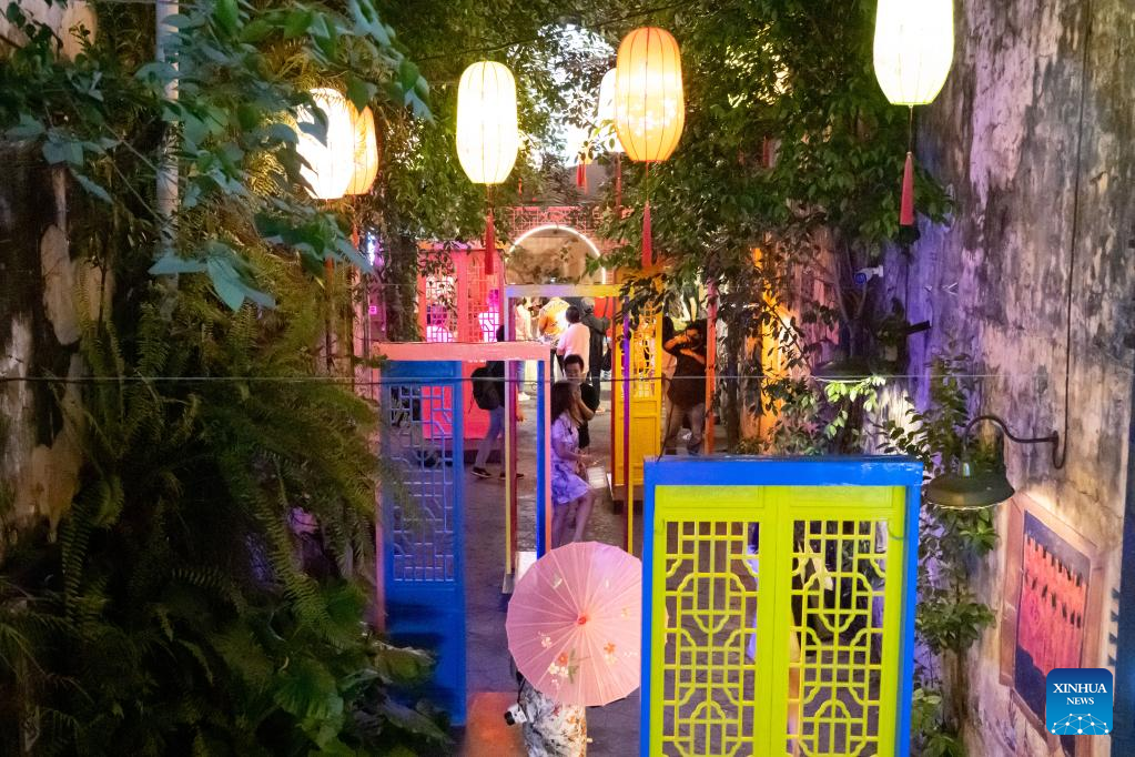 People visit the "Beyond the Moonlit Door" art installation show during a media preview at Kwai Chai Hong in Kuala Lumpur, Malaysia on Aug. 25, 2022. The art installation show "Beyond the Moonlit Door" will be open to the public from Aug. 26 to Oct. 2 in celebration of Mid-Autumn Festival. (Xinhua/Zhu Wei)
