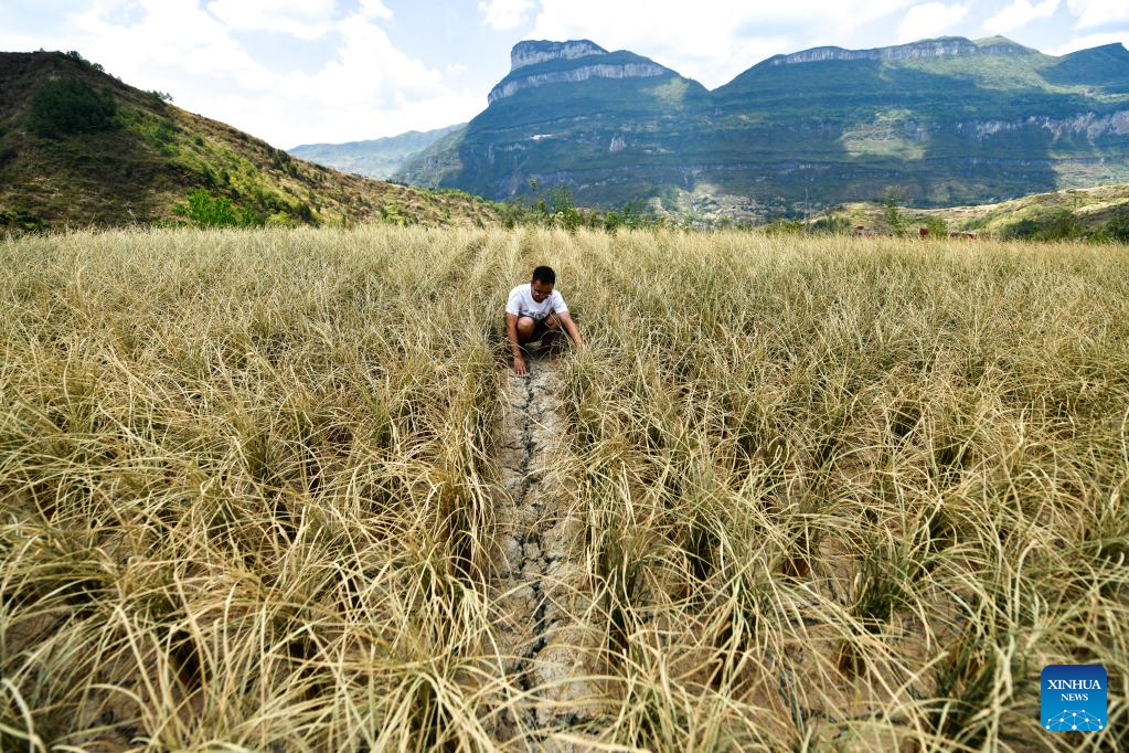 An official checks rice damage caused by drought in Tangshan Village of Shixi Township, Tongzi County of Zunyi City, southwest China's Guizhou Province, Aug. 24, 2022. China's national observatory issued an orange alert for drought on Friday as heatwaves persisted in multiple regions.