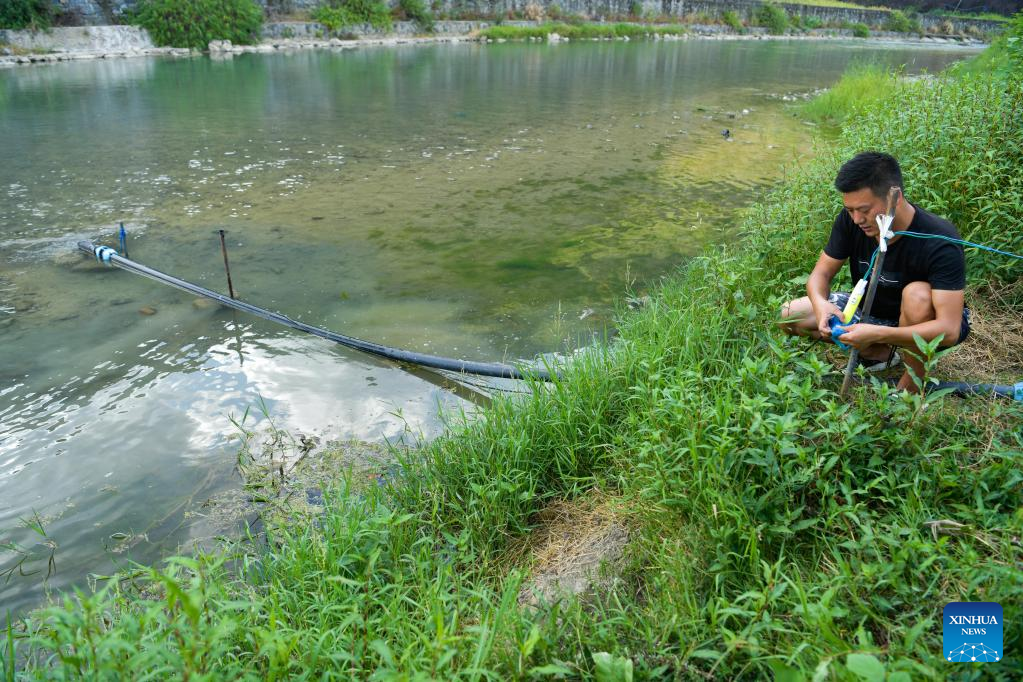 A villager pumps water to irrigate rice fields in Daxing Village of Shixi Township, Tongzi County of Zunyi City, southwest China's Guizhou Province, Aug. 24, 2022. China's national observatory issued an orange alert for drought on Friday as heatwaves persisted in multiple regions.