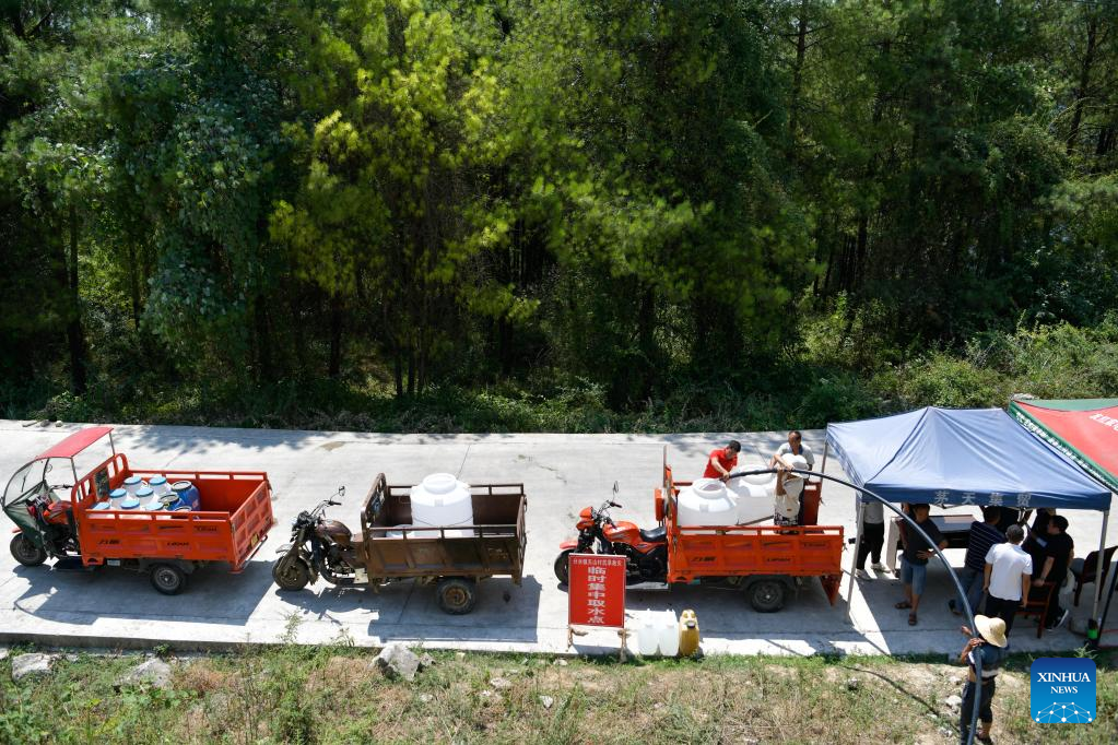 Villagers collect water at a temporary water collection site in Tianshan Village of Fenshui Township, Wuchuan County of Zunyi City, southwest China's Guizhou Province, Aug. 25, 2022. China's national observatory issued an orange alert for drought on Friday as heatwaves persisted in multiple regions.