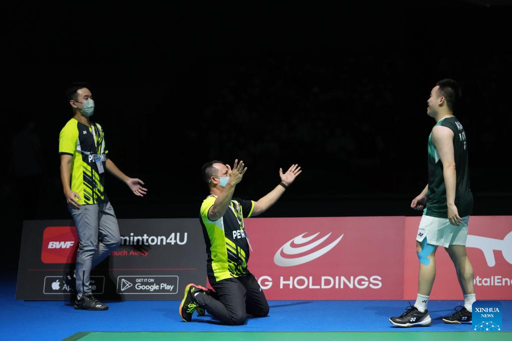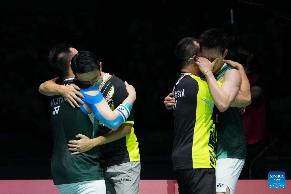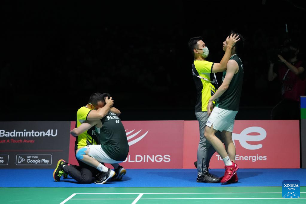 Aaron Chia (R) of Malaysia celebrates with coaches after winning the men's doubles final match against Mohammad Ahsan/Hendra Setiawan of Indonesia at the BWF World Championships 2022 in Tokyo, Japan, Aug. 28, 2022. (Xinhua/Zhang Xiaoyu)