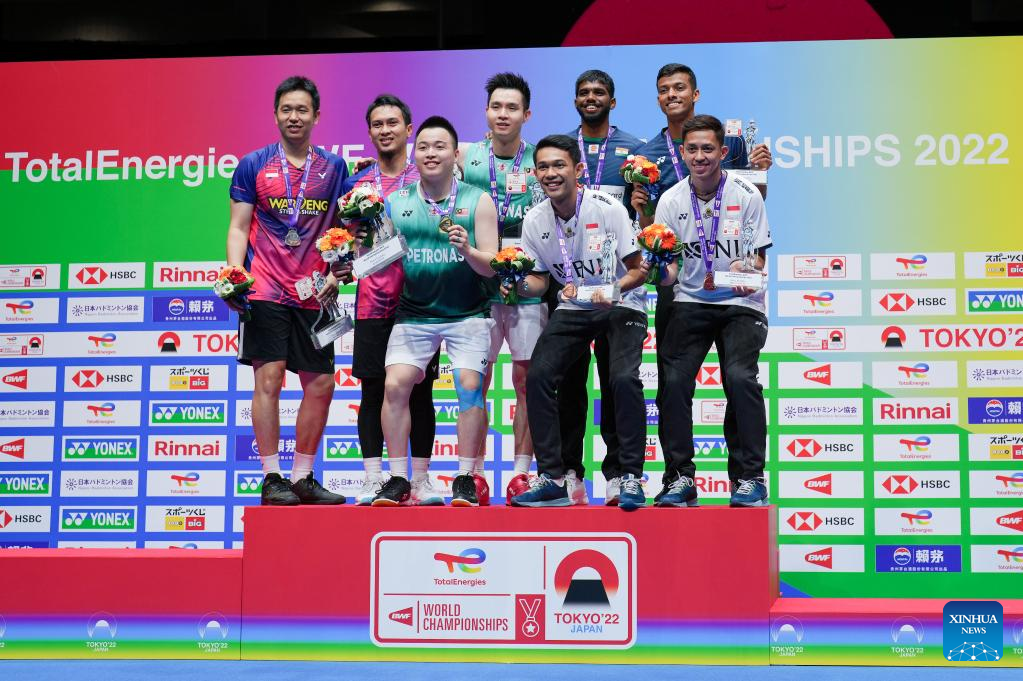 Gold medalists Soh Wooi Yik (4th L)/Aaron Chia (3rd L) of Malaysia, silver medalists Mohammad Ahsan (2nd L)/Hendra Setiawan (1st L) of Indonesia and bronze medalists Muhammad Rian Ardianto (1st R)/Fajar Alfian (4th R) of Indonesia, Chirag Shetty (2nd R)/Satwiksairaj Rankireddy of India pose for photos on the podium after the men's doubles final match at the BWF World Championships 2022 in Tokyo, Japan, Aug. 28, 2022. (Xinhua/Zhang Xiaoyu)
