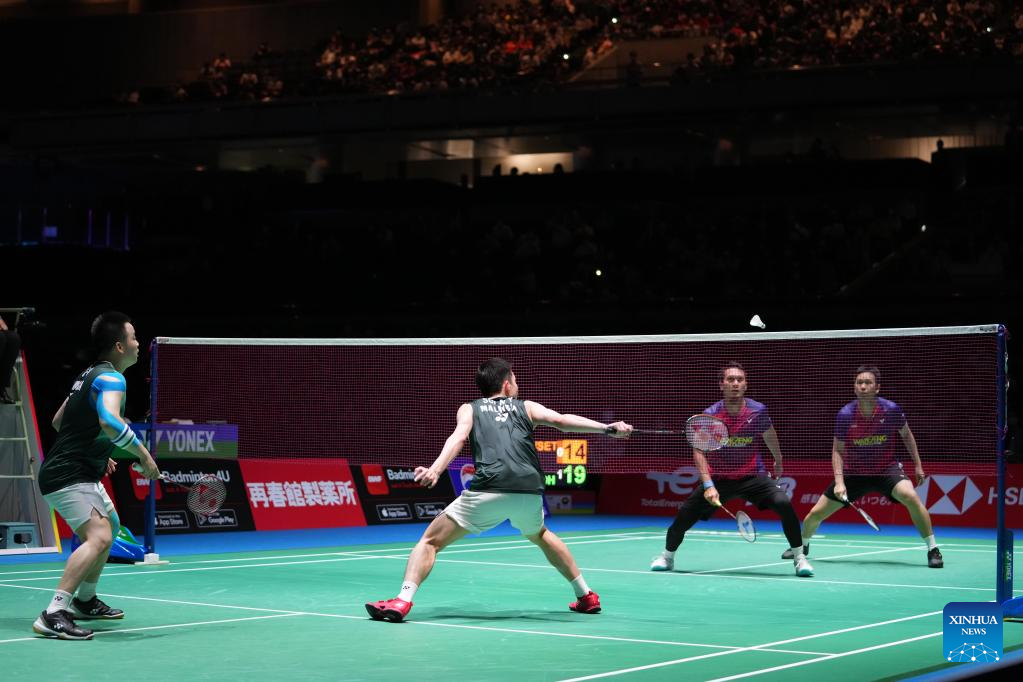 Soh Wooi Yik (2nd L)/Aaron Chia (1st L) of Malaysia compete during the men's doubles final match against Mohammad Ahsan/Hendra Setiawan of Indonesia at the BWF World Championships 2022 in Tokyo, Japan, Aug. 28, 2022. (Xinhua/Zhang Xiaoyu)