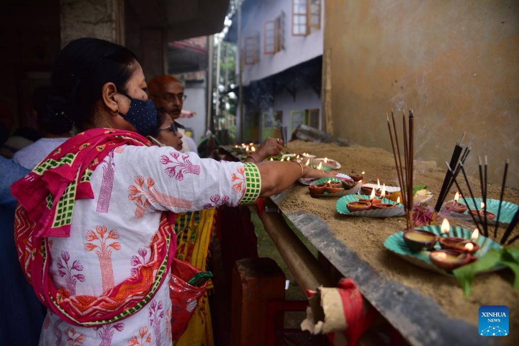 Devotees offer prayers at a temple on the occasion of Ganesh Chaturthi festival in Nagaon district of India's northeastern state of Assam, Aug. 31, 2022. (Str/Xinhua)