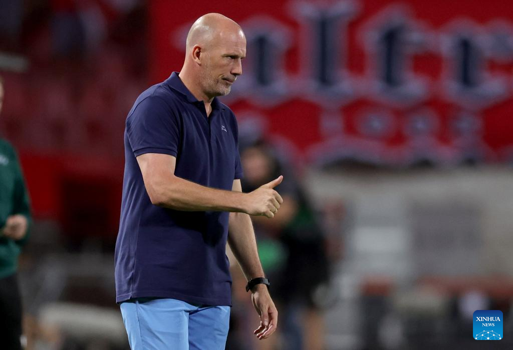 Monaco's head coach Philippe Clement gestures during the UEFA Europa League football match between Crvena Zvezda and Monaco in Belgrade, Serbia, Sept. 8, 2022. (Photo by Predrag Milosavljevic/Xinhua)