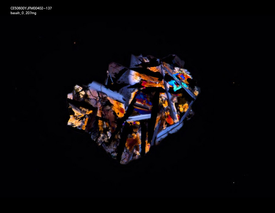 The micrograph taken in July 2022 shows the crossed polarized light image of the thin section of a basalt lunar soil particle. (Institute of Geology and Geophysics, CAS/Handout via Xinhua)