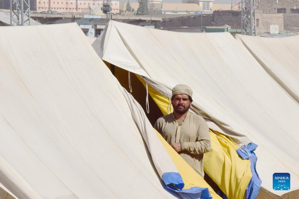 A flood-affected man is seen outside his makeshift shelter on the outskirts of southwest Pakistan's Quetta on Sept. 16, 2022. At least 37 more people were killed and 92 others injured in heavy monsoon rain-triggered flash floods in Pakistan, the country's National Disaster Management Authority (NDMA) said. According to a report released by the NDMA on Friday evening, 16 children and seven women were among those newly killed in separate flood-related incidents. (Photo by Asad/Xinhua)
