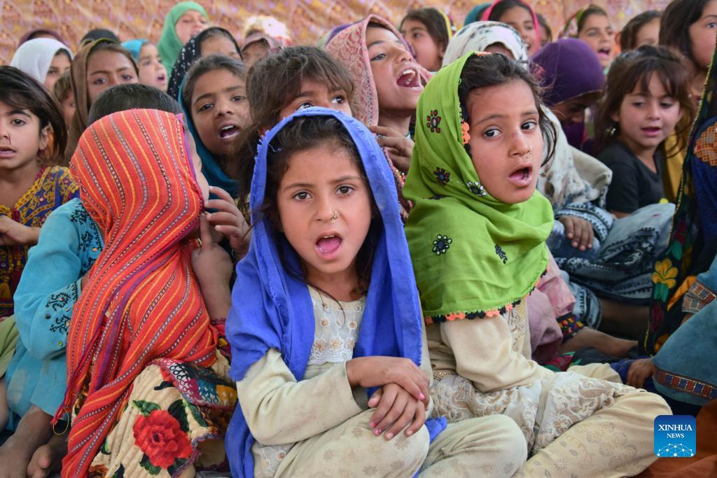 Flood-affected children are seen at a makeshift shelter on the outskirts of southwest Pakistan's Quetta on Sept. 16, 2022. At least 37 more people were killed and 92 others injured in heavy monsoon rain-triggered flash floods in Pakistan, the country's National Disaster Management Authority (NDMA) said. According to a report released by the NDMA on Friday evening, 16 children and seven women were among those newly killed in separate flood-related incidents. (Photo by Asad/Xinhua)