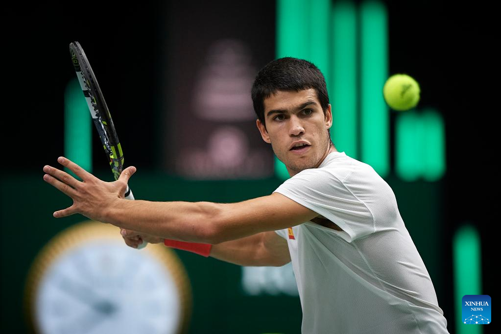 Carlos Alcaraz of Spain returns a ball in the men's singles match against Felix Auger Aliassime of Canada during the group B match between Spain and Canada at the Davis Cup tennis tournament in Valencia, Spain, on Sept. 16, 2022. (Str/Xinhua)