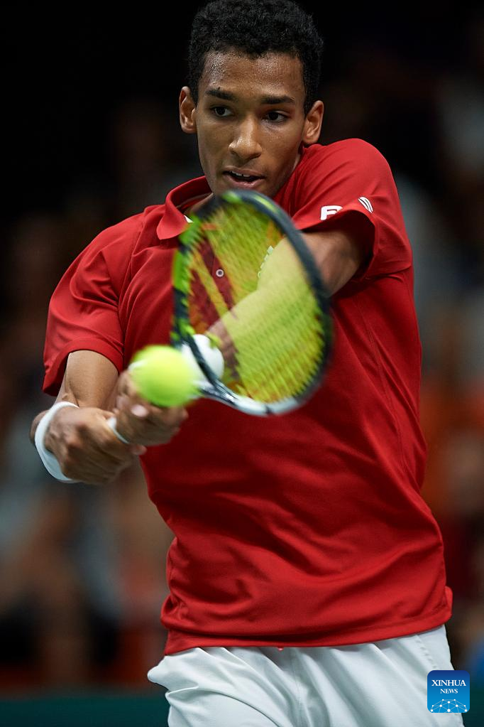 Felix Auger Aliassime of Canada returns a ball in the men's singles match against Carlos Alcaraz of Spain during the group B match between Spain and Canada at the Davis Cup tennis tournament in Valencia, Spain, on Sept. 16, 2022. (Str/Xinhua)