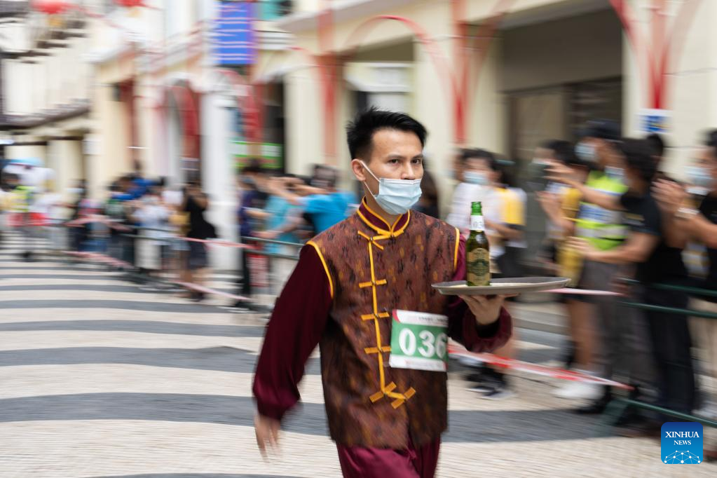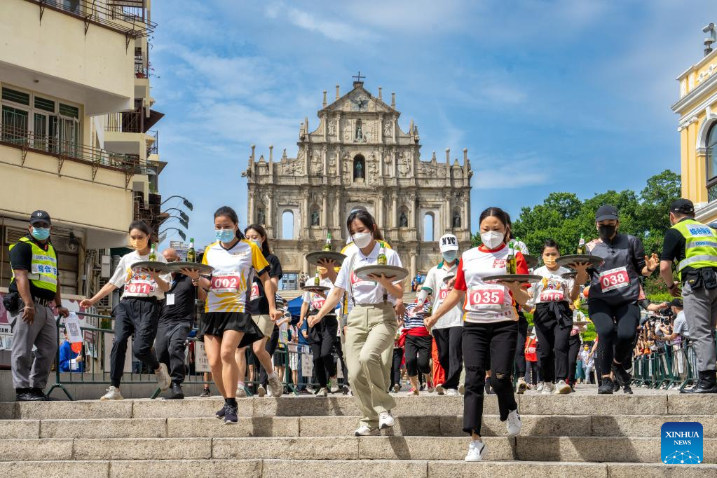 Participants take part in a tray race marking the World Tourism Day in Macao, south China, Sept. 27, 2022. A tray race was held in Macao to mark the World Tourism Day on Tuesday. About 130 participants from the local catering and tourism industries took part in the race covering a distance from the Ruins of St. Paul's to the Senado Square . (Xinhua/Cheong Kam Ka)