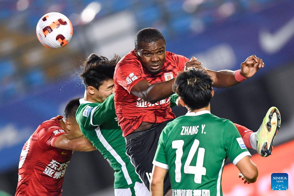 Jores Okore (2nd R) of Changchun Yatai heads for the ball during a 2022 season Chinese Football Association Super League (CSL) match between Changchun Yatai and Shenzhen FC in Changchun, northeast China's Jilin Province, Sept. 30, 2022. (Xinhua/Xu Chang)