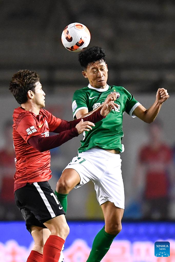 Zhang Yuan (R) of Shenzhen FC heads for the ball during a 2022 season Chinese Football Association Super League (CSL) match between Changchun Yatai and Shenzhen FC in Changchun, northeast China's Jilin Province, Sept. 30, 2022. (Xinhua/Xu Chang)