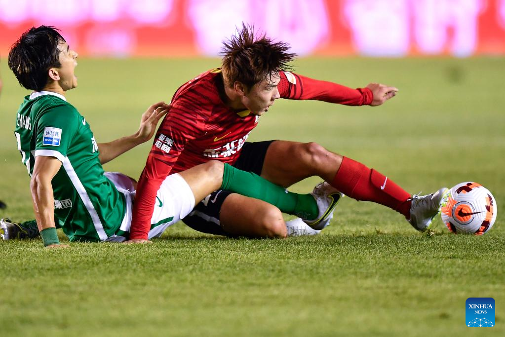 Zhang Yufeng (R) of Changchun Yatai competes during a 2022 season Chinese Football Association Super League (CSL) match between Changchun Yatai and Shenzhen FC in Changchun, northeast China's Jilin Province, Sept. 30, 2022. (Xinhua/Xu Chang)