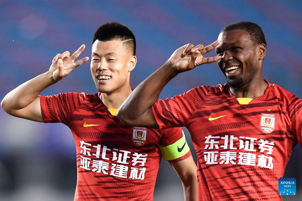 Tan Long (L) of Changchun Yatai celebrates scoring with teammate Jores Okore during a 2022 season Chinese Football Association Super League (CSL) match between Changchun Yatai and Shenzhen FC in Changchun, northeast China's Jilin Province, Sept. 30, 2022. (Xinhua/Xu Chang)