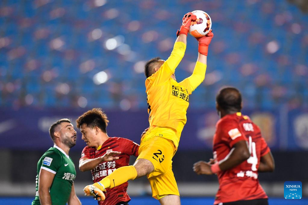 Wu Yake (2nd R), goalkeeper of Changchun Yatai, makes a save during a 2022 season Chinese Football Association Super League (CSL) match between Changchun Yatai and Shenzhen FC in Changchun, northeast China's Jilin Province, Sept. 30, 2022. (Xinhua/Xu Chang)