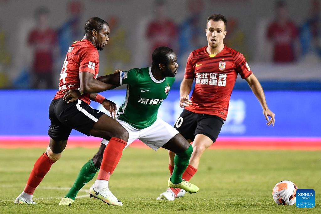 Frank Acheampong (C) of Shenzhen FC competes during a 2022 season Chinese Football Association Super League (CSL) match between Changchun Yatai and Shenzhen FC in Changchun, northeast China's Jilin Province, Sept. 30, 2022. (Xinhua/Xu Chang)