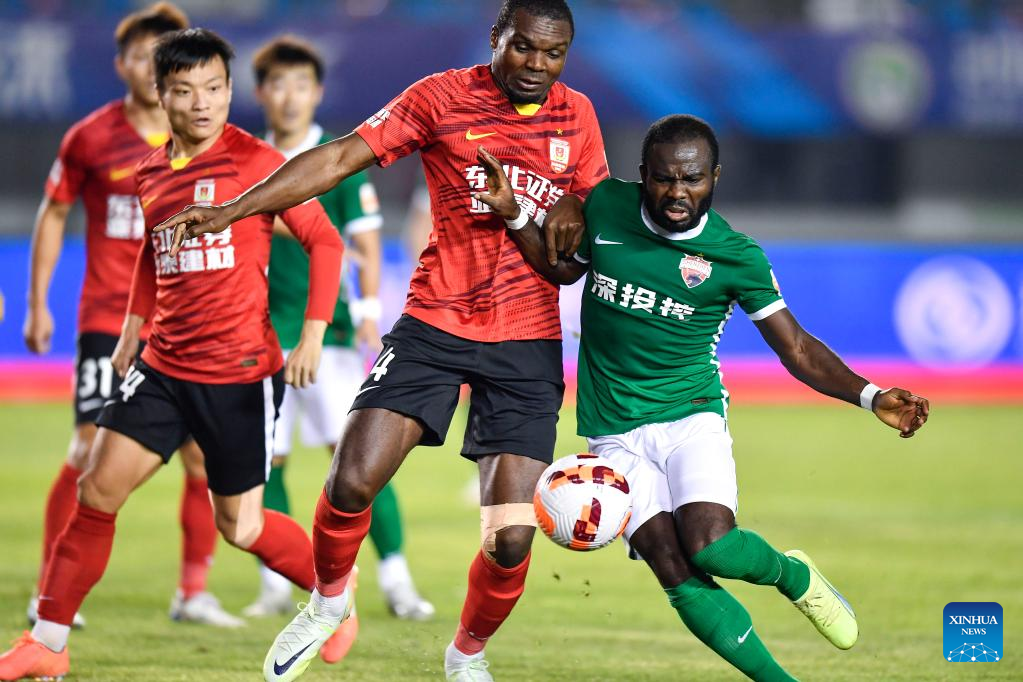 Frank Acheampong (1st R) of Shenzhen FC vies with Jores Okore (2nd R) of Changchun Yatai during a 2022 season Chinese Football Association Super League (CSL) match in Changchun, northeast China's Jilin Province, Sept. 30, 2022. (Xinhua/Xu Chang)