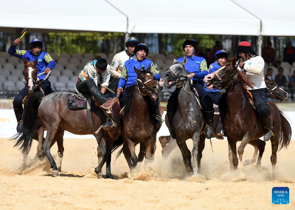 Horsemen compete in the traditional sport of goat dragging at the 4th World Nomad Games in Iznik, Türkiye, Sept. 29, 2022. (Xinhua/Shadati)