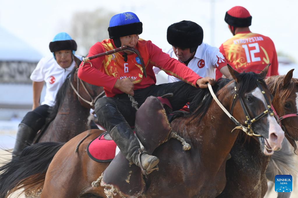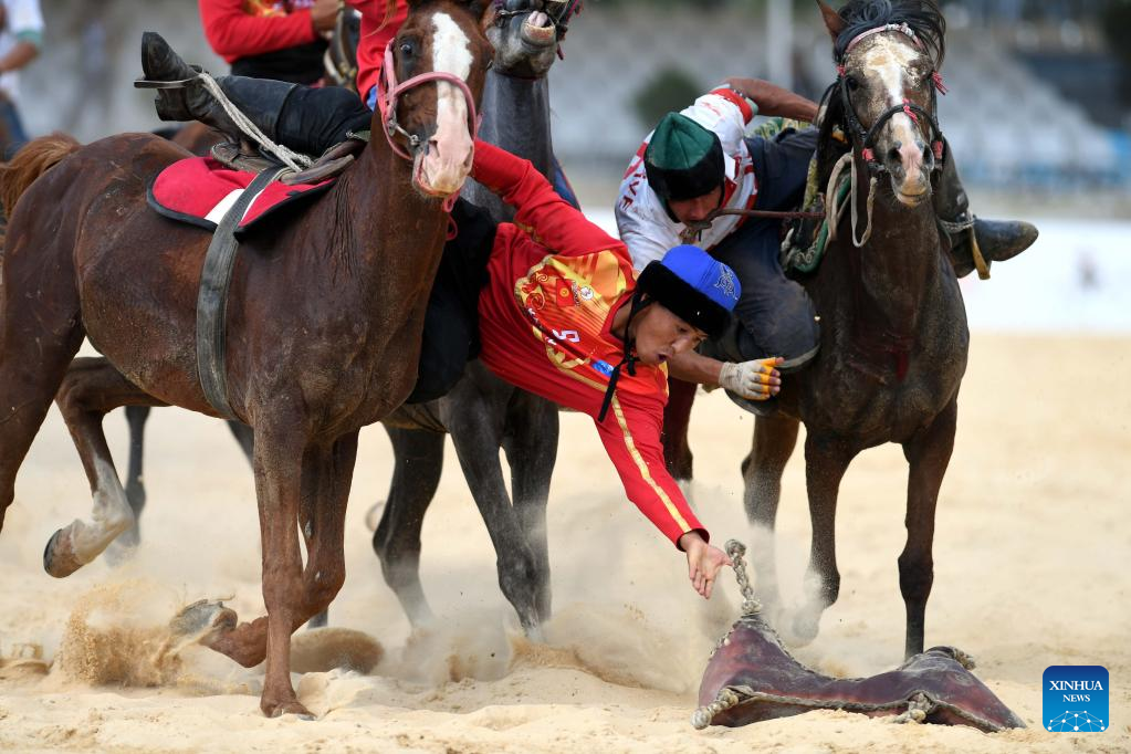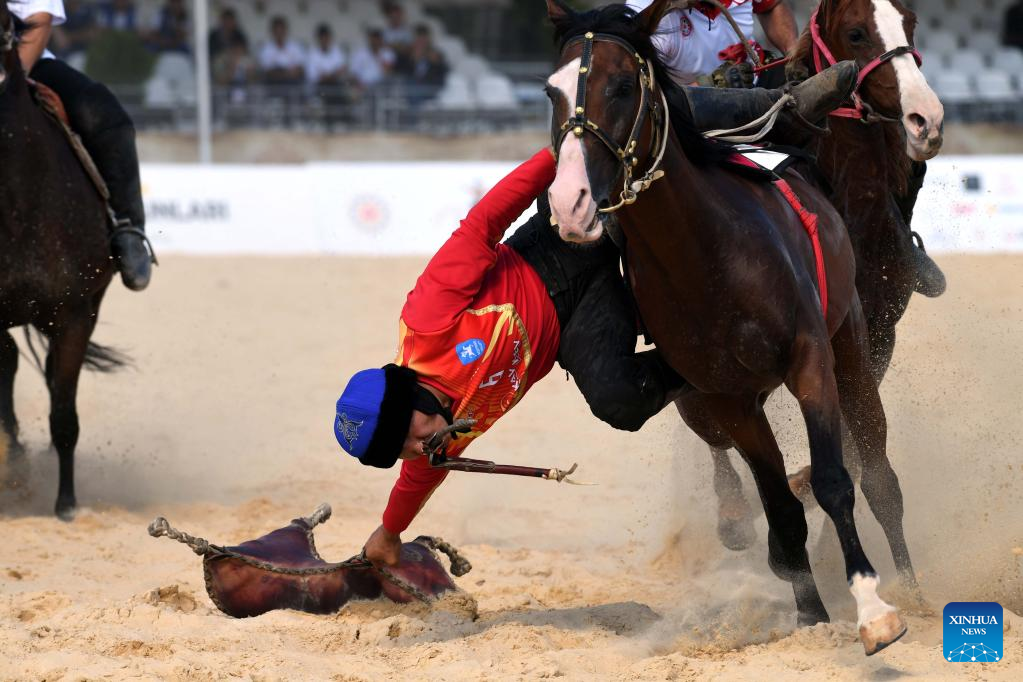 A horseman competes in the traditional sport of goat dragging of the 4th World Nomad Games in Iznik, Türkiye, Sept. 29, 2022. (Xinhua/Shadati)
