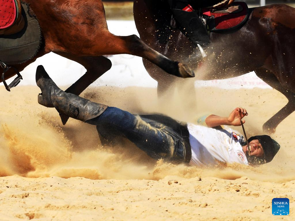 A horseman falls off the horse in the traditional sport of goat dragging of the 4th World Nomad Games in Iznik, Türkiye, Sept. 29, 2022. (Xinhua/Shadati)
