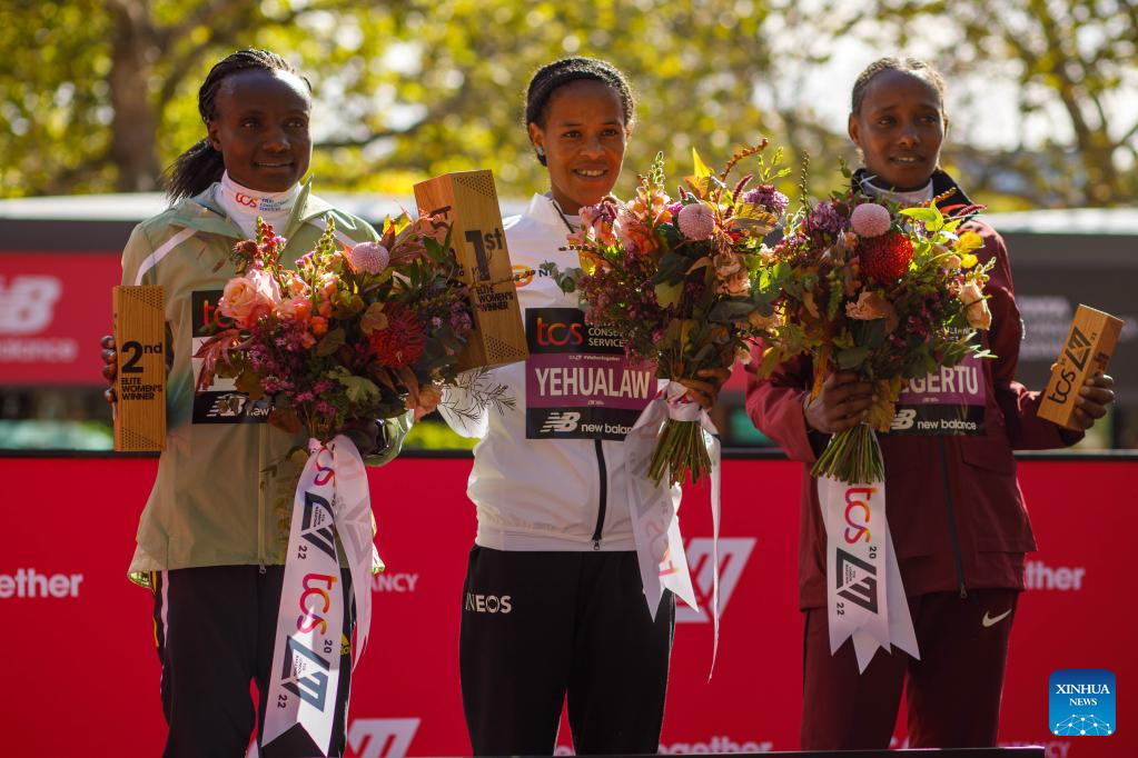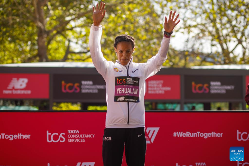 The 23-year-old Ethiopian was 41 seconds ahead of defending champion Joyciline Jepkosgei of Kenya. Yehualaw's compatriot Alemu Megertu was third in 2:18:32.