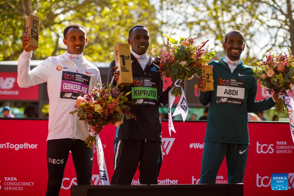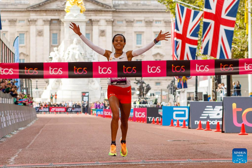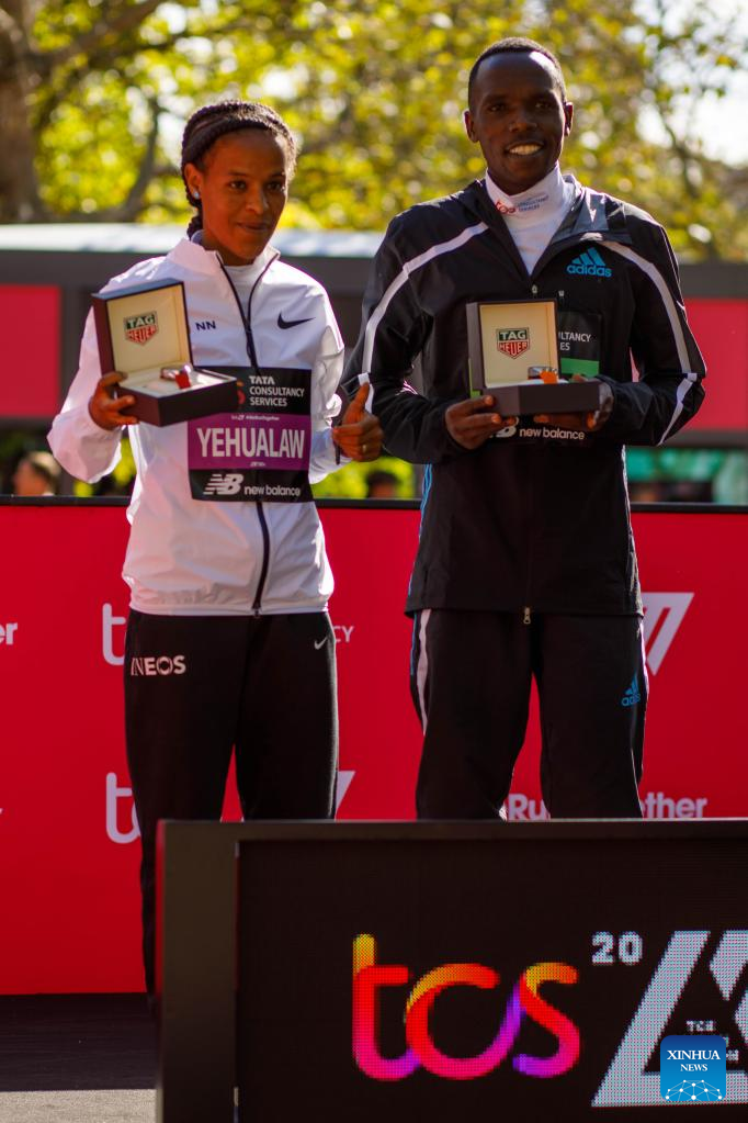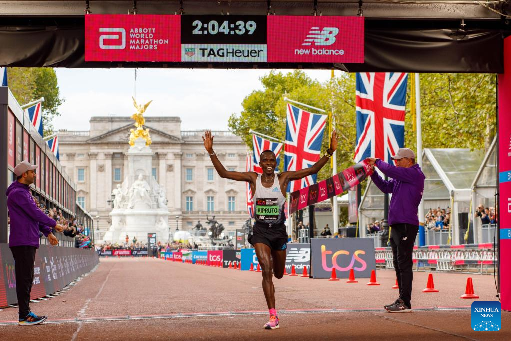 LONDON, Oct. 2 (Xinhua) -- Kenya's Amos Kipruto and Yalemzerf Yehualaw from Ethiopia won the men's and women's elite races at the London Marathon here on Sunday.