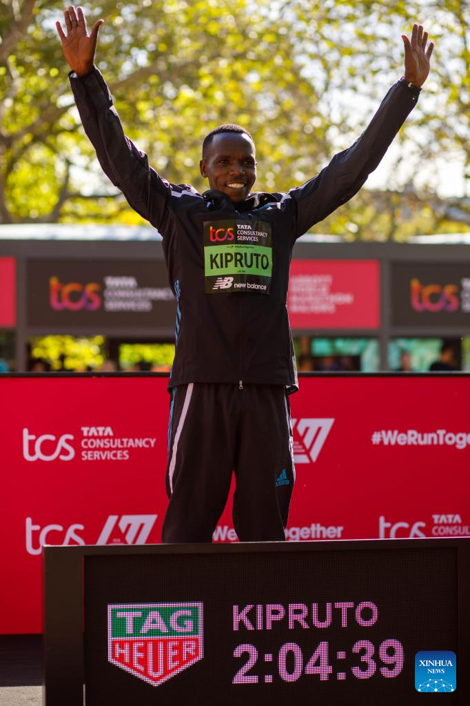 Kipruto took the men's title in 2:04:39. Ethiopia's Leul Gebresilase and Bashir Abdi of Belgium followed in second and third, in 2:05:12 and 2:05:19, respectively.
