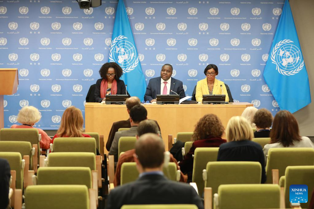 Michel Xavier Biang (rear C), permanent representative of Gabon to the United Nations and president of the UN Security Council for the month of October, speaks at a press conference at the UN headquarters in New York, Oct. 3, 2022. (Xinhua/Xie E)