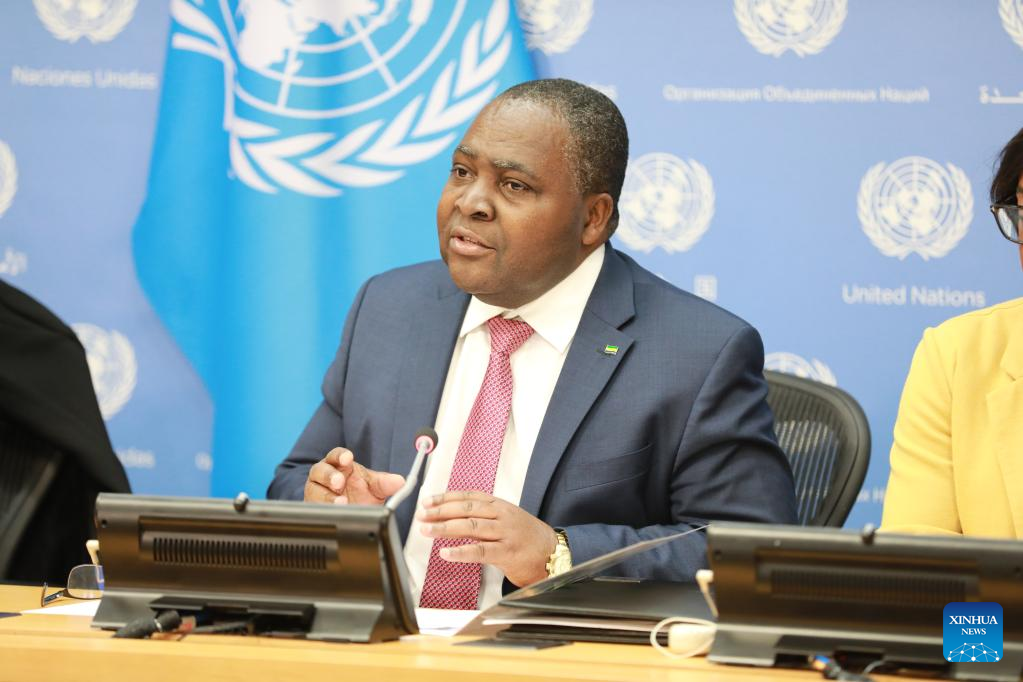 Michel Xavier Biang, permanent representative of Gabon to the United Nations and president of the UN Security Council for the month of October, speaks at a press conference at the UN headquarters in New York, Oct. 3, 2022. (Xinhua/Xie E)