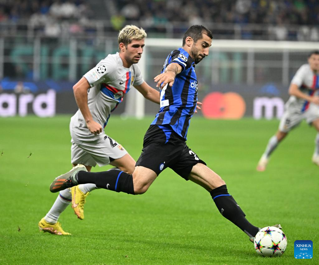 FC Inter's Henrikh Mkhitaryan (R) vies with Barcelona's Pedri during the UEFA Champions League Group C match between FC Inter and Barcelona in Milan, Italy, on Oct. 4, 2022. (Photo by Alberto Lingria/Xinhua)