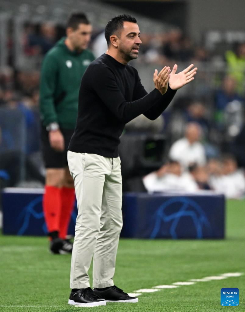 Barcelona's head coach Xavi Hernandez gestures during the UEFA Champions League Group C match between FC Inter and Barcelona in Milan, Italy, on Oct. 4, 2022. (Photo by Alberto Lingria/Xinhua)