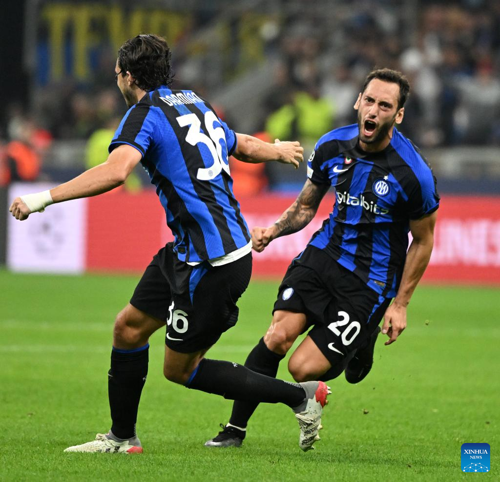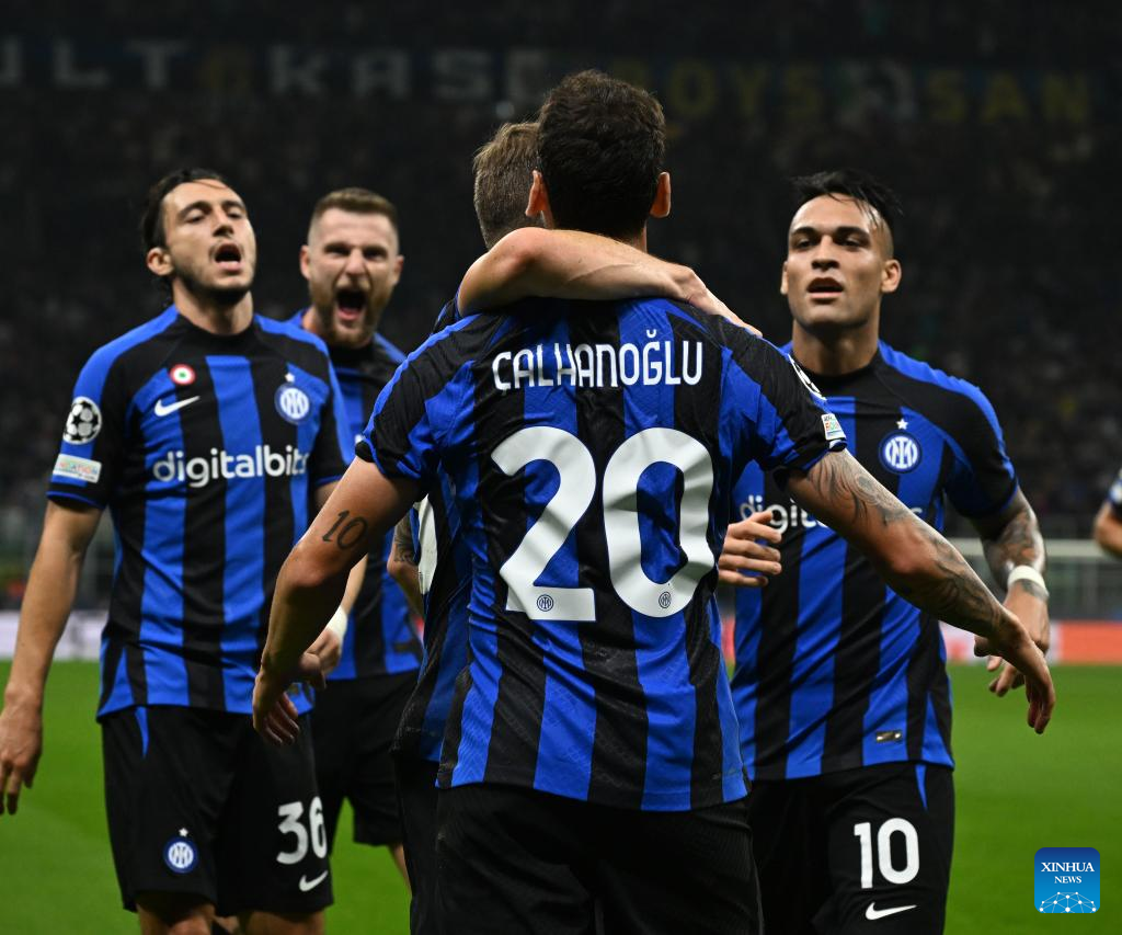 FC Inter's Hakan Calhanoglu (front) celebrates scoring with teammates during the UEFA Champions League Group C match between FC Inter and Barcelona in Milan, Italy, on Oct. 4, 2022. (Photo by Alberto Lingria/Xinhua)