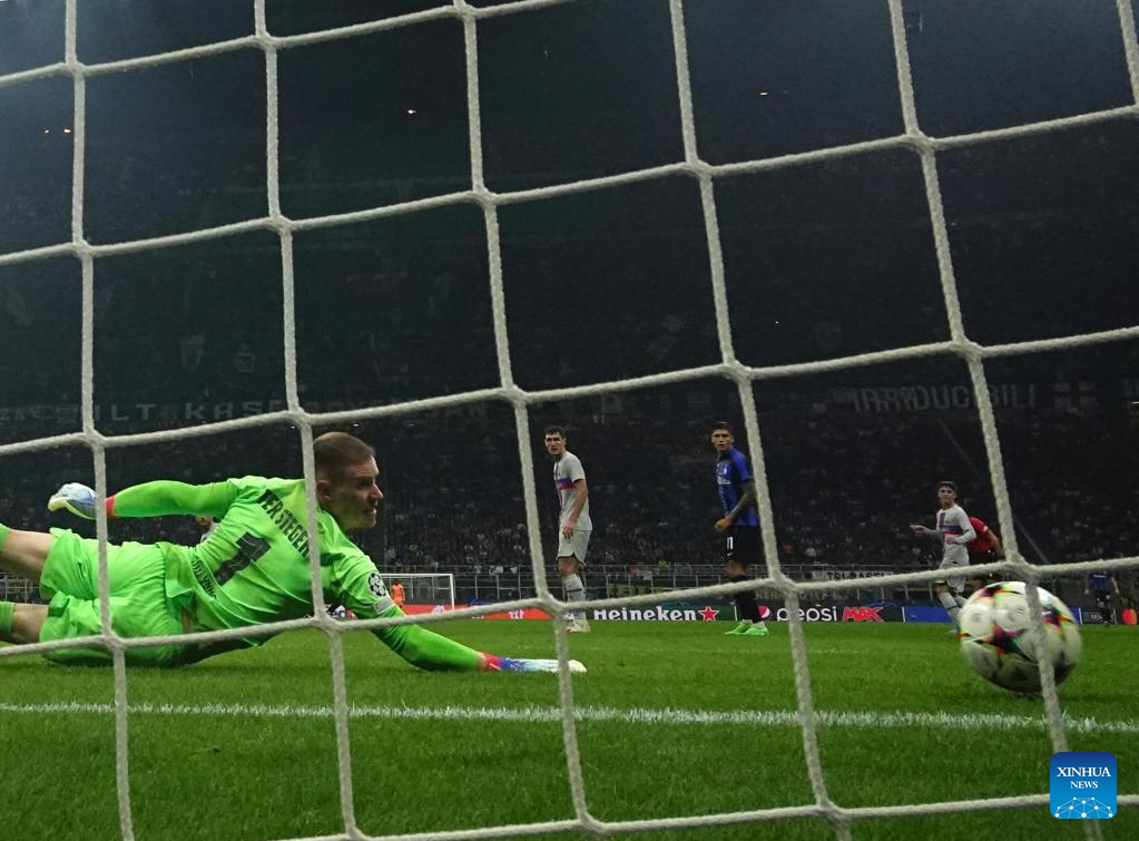 Barcelona's goalkeeper Marc-Andre ter Stegen (1st L) fails to save FC Inter's Hakan Calhanoglu's shot during the UEFA Champions League Group C match between FC Inter and Barcelona in Milan, Italy, on Oct. 4, 2022. (Photo by Alberto Lingria/Xinhua)