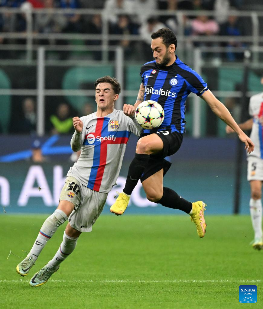 FC Inter's Hakan Calhanoglu (R) vies with Barcelona's Gavi during the UEFA Champions League Group C match between FC Inter and Barcelona in Milan, Italy, on Oct. 4, 2022. (Photo by Alberto Lingria/Xinhua)