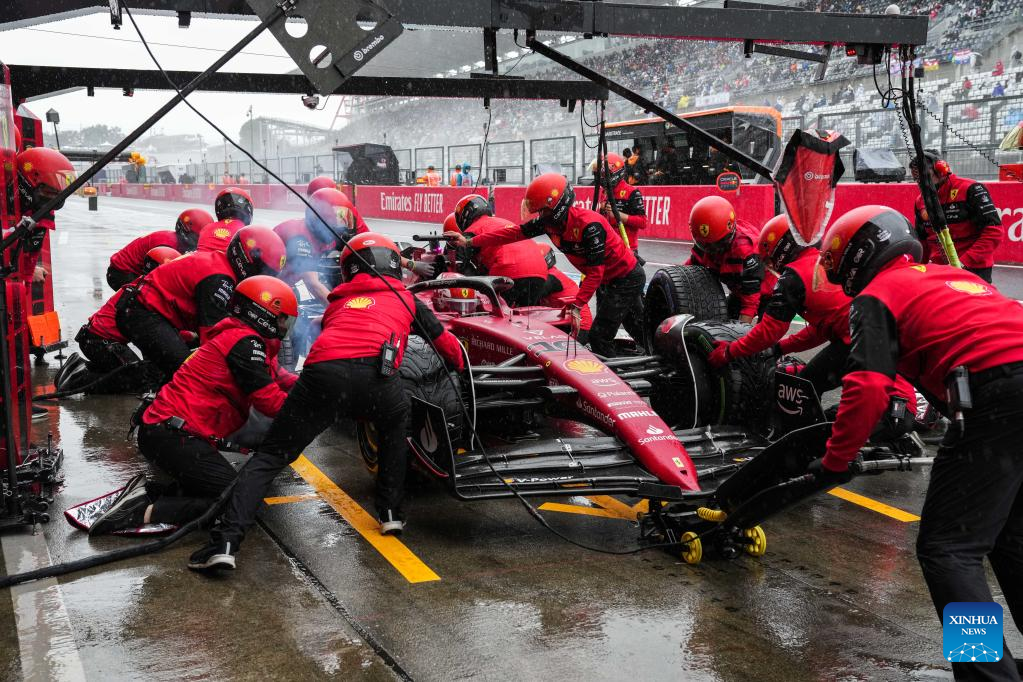 Ferrari's Monegasque driver Charles Leclerc makes a pit stop during the first practice session of the Formula One Japan Grand Prix held at the Suzuka Circuit in Suzuka City, Japan, on Oct. 7, 2022. (Xinhua/Zhang Xiaoyu)