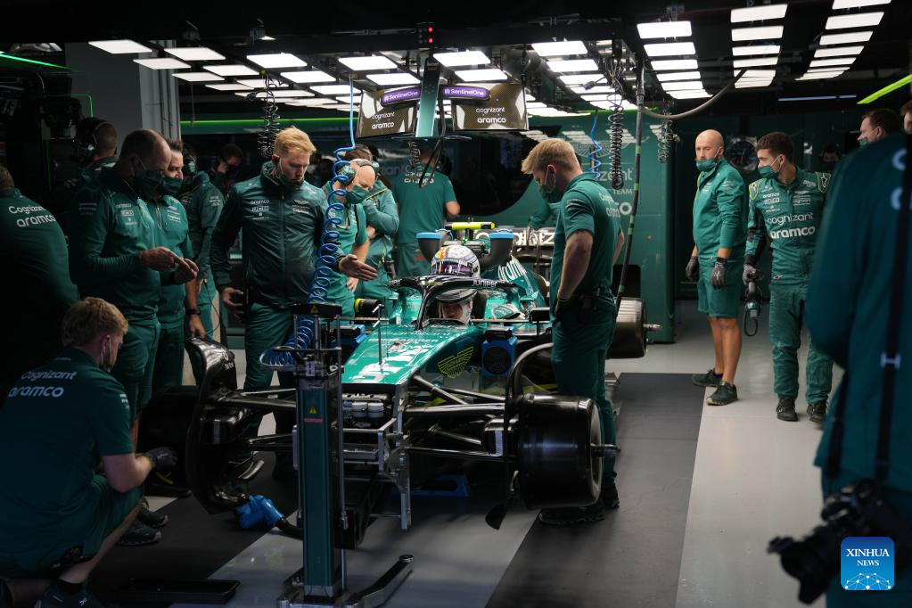Aston Martin's German driver Sebastian Vettel makes a pit stop during the first practice session of the Formula One Japan Grand Prix held at the Suzuka Circuit in Suzuka City, Japan, on Oct. 7, 2022. (Xinhua/Zhang Xiaoyu)