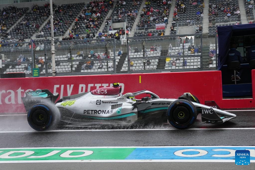 Mercedes' British driver George Russell drives in the rain during the first practice session of the Formula One Japan Grand Prix held at the Suzuka Circuit in Suzuka City, Japan, on Oct. 7, 2022. (Xinhua/Zhang Xiaoyu)