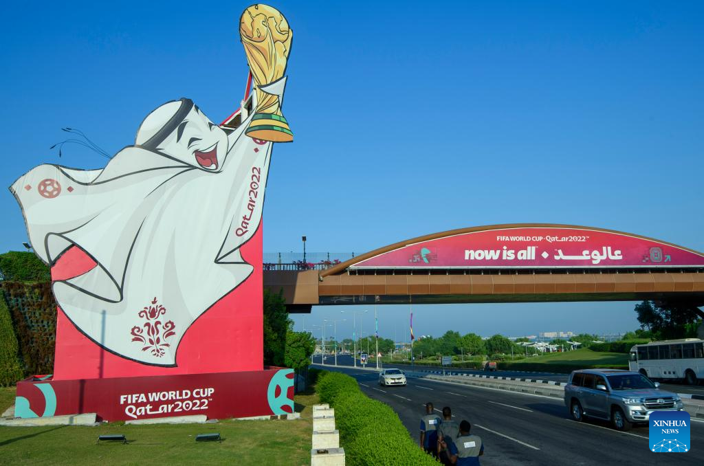 A large Qatar 2022 FIFA World Cup welcome billboard is displayed beside street in Doha, Qatar on Oct. 7, 2022. (Photo by Nikku/Xinhua)