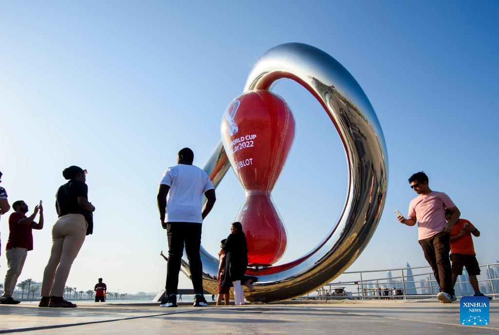 People take photos in front of the Qatar 2022 FIFA World Cup countdown clock in Doha, Qatar, on Oct. 7, 2022. (Photo by Nikku/Xinhua)