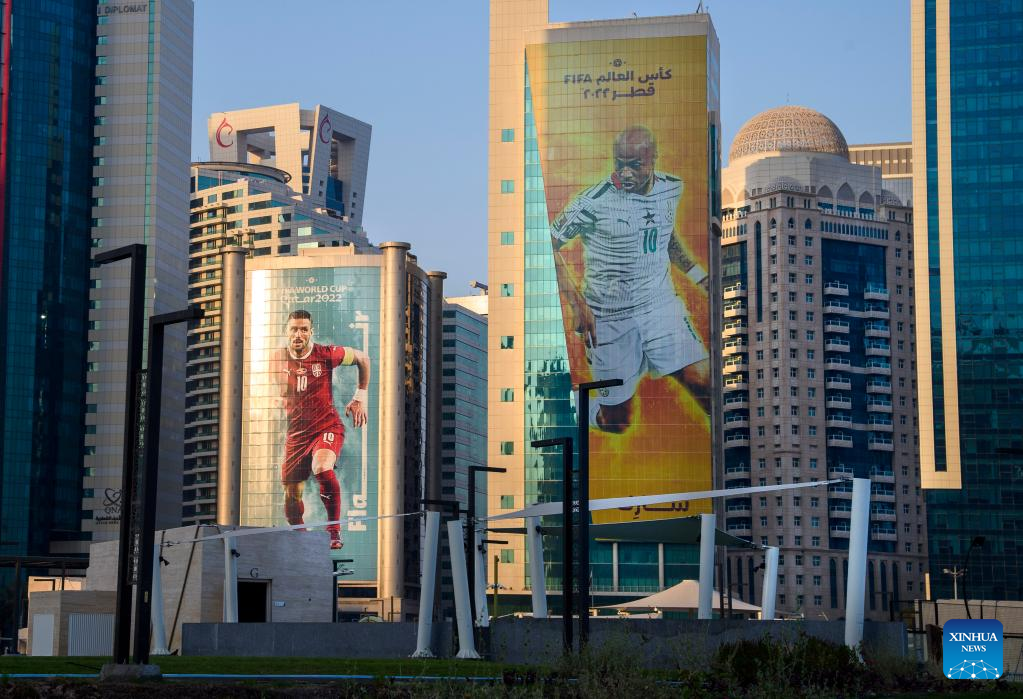 Posters of Serbia's player Dusan Tadic (L) and Ghana's player Andre Ayew are seen in Doha, Qatar, on Oct. 7, 2022. (Photo by Nikku/Xinhua)