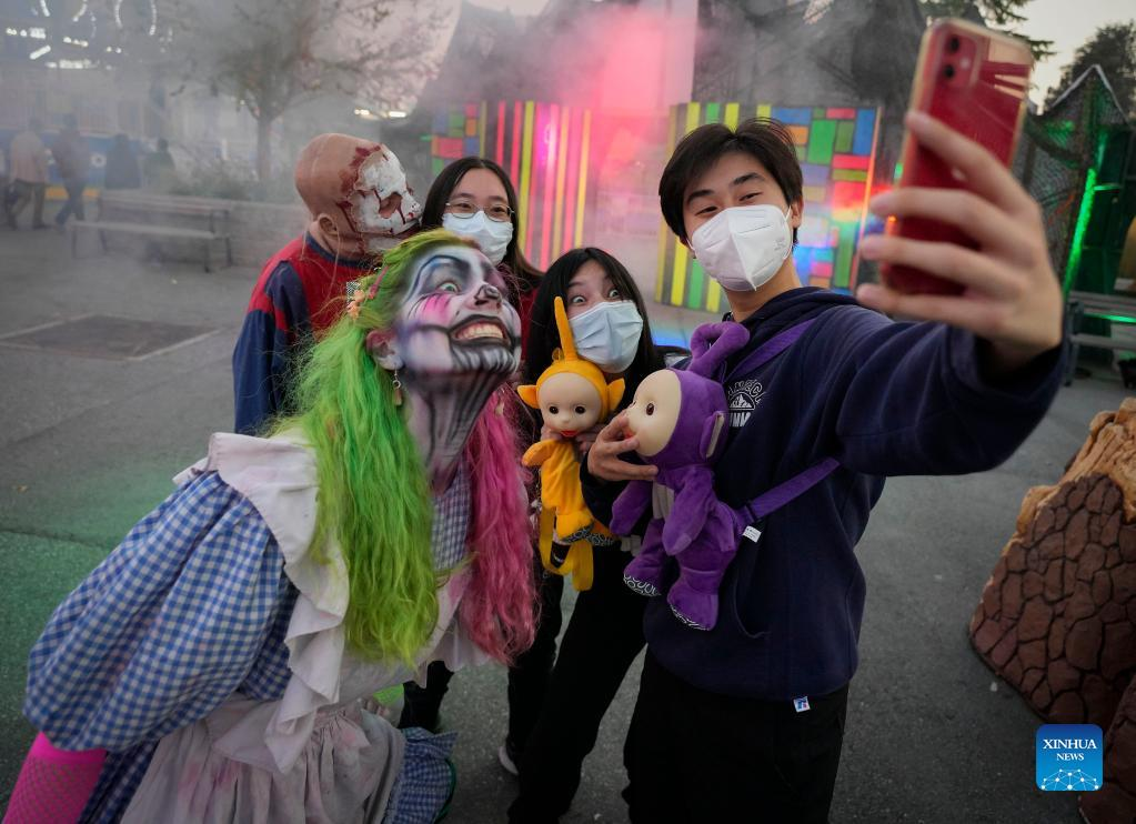 A costumed staff member poses for photos during the "Fright Nights" at Pacific National Exhibition in Vancouver, Canada, Oct. 7, 2022. The Halloween-themed event kicked off here on Friday, featuring seven haunted houses, 15 rides, and live performances with over 70 costumed actors. The event runs from Oct. 7 to 31. (Photo by Liang Sen/Xinhua)
