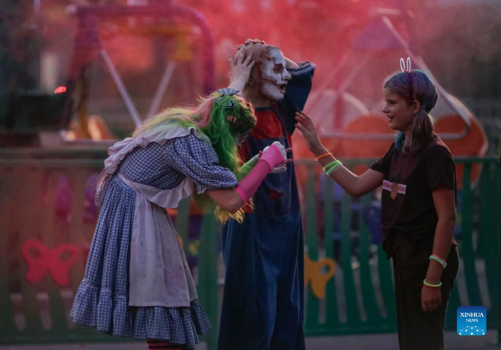 Costumed staff members interact with a visitor during the "Fright Nights" at Pacific National Exhibition in Vancouver, Canada, Oct. 7, 2022. The Halloween-themed event kicked off here on Friday, featuring seven haunted houses, 15 rides, and live performances with over 70 costumed actors. The event runs from Oct. 7 to 31. (Photo by Liang Sen/Xinhua)