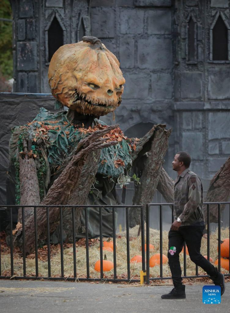 A person walks past a Halloween attraction while visiting the "Fright Nights" at Pacific National Exhibition in Vancouver, Canada, Oct. 7, 2022. The Halloween-themed event kicked off here on Friday, featuring seven haunted houses, 15 rides, and live performances with over 70 costumed actors. The event runs from Oct. 7 to 31. (Photo by Liang Sen/Xinhua)