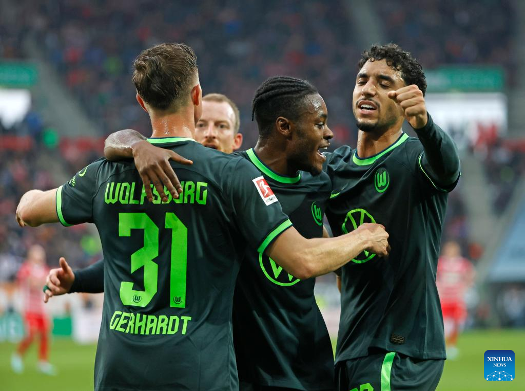 Yannick Gerhardt (1st L) of Wolfsburg celebrates scoring with his teammates during the German first division Bundesliga football match between FC Augsburg and VfL Wolfsburg in Augsburg, Germany, Oct. 8, 2022. (Photo by Philippe Ruiz/Xinhua)