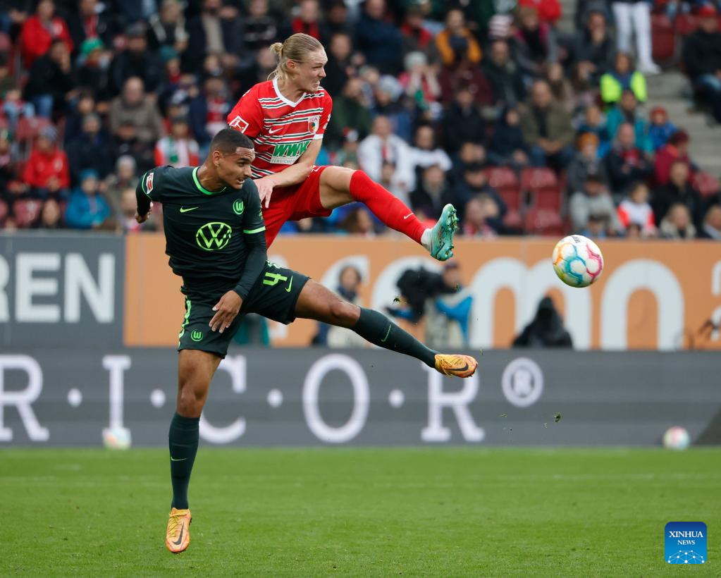Yannick Gerhardt (1st R) of Wolfsburg shoots during the German first division Bundesliga football match between FC Augsburg and VfL Wolfsburg in Augsburg, Germany, Oct. 8, 2022. (Photo by Philippe Ruiz/Xinhua)