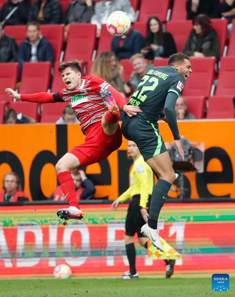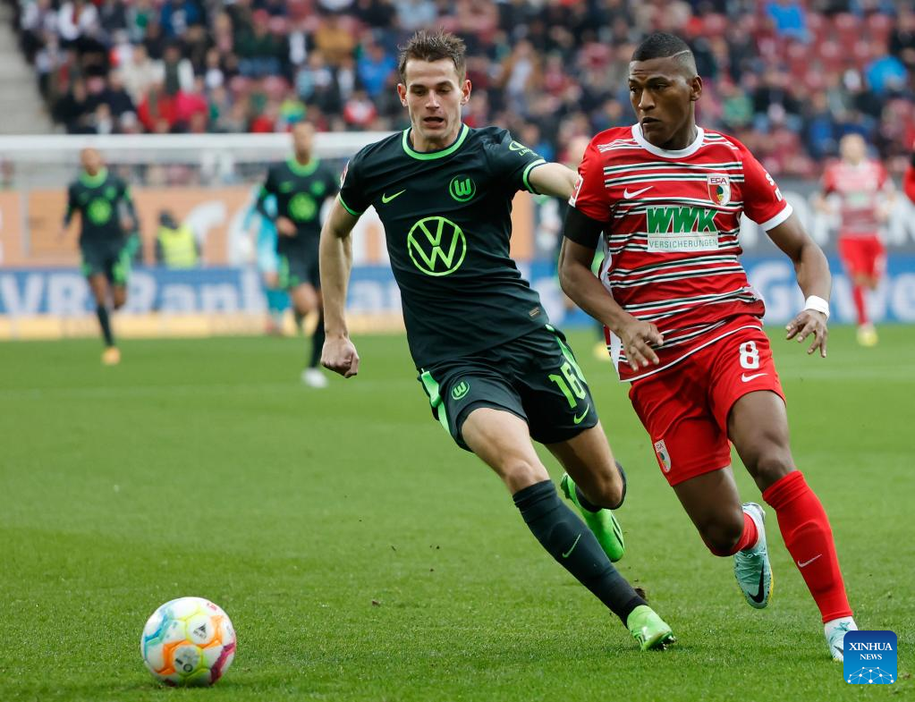 Maximilian Bauer (R) of Augsburg vies with Omar Marmoush of Wolfsburg during their German first division Bundesliga football match in Augsburg, Germany, Oct. 8, 2022. (Photo by Philippe Ruiz/Xinhua)