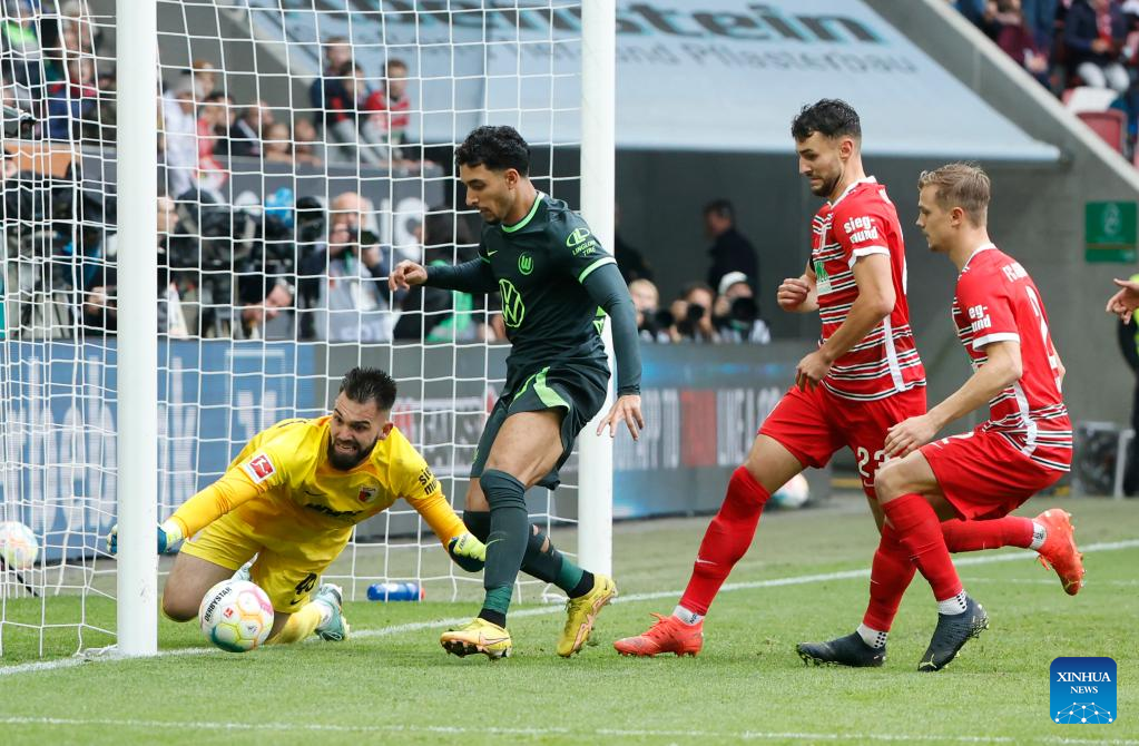 Augsburg's goalkeeper Tomas Koubek (1st L) tries to save the ball during the German first division Bundesliga football match between FC Augsburg and VfL Wolfsburg in Augsburg, Germany, Oct. 8, 2022. (Photo by Philippe Ruiz/Xinhua)