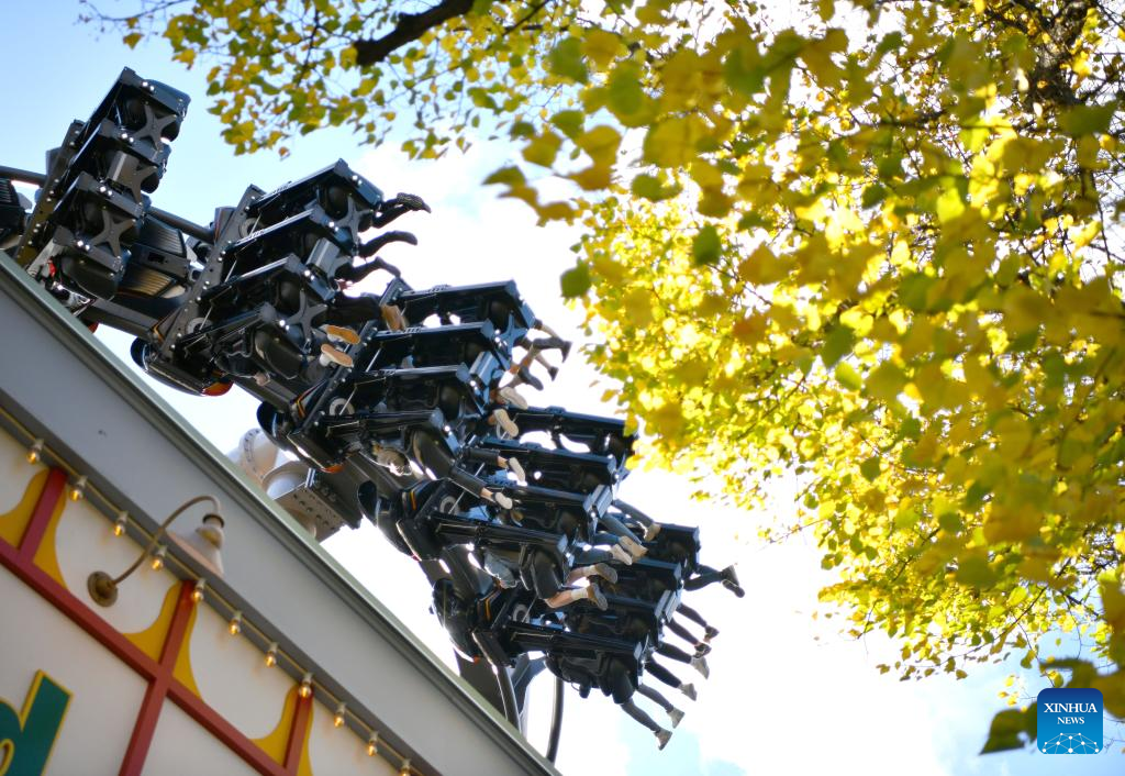 People take a roller coaster at an amusement park in Stockholm, Sweden, Oct. 8, 2022. (Xinhua/Ren Pengfei)