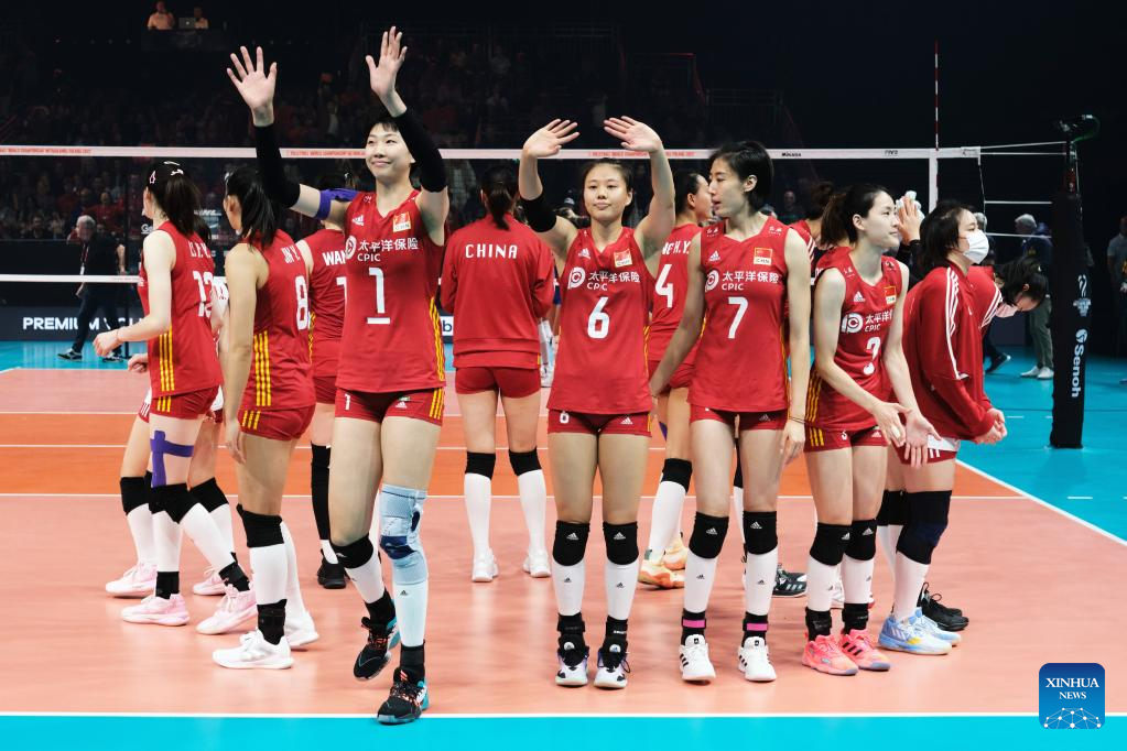 Players of China greet fans after the quarterfinal match between China and Italy at the 2022 Volleyball Women's World Championship in Apeldoorn, the Netherlands, Oct. 11, 2022. (Xinhua/Meng Dingbo)